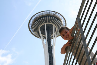 A beautiful day in Seattle with the sun gleaming off the EMP with the Monorail zipping by.